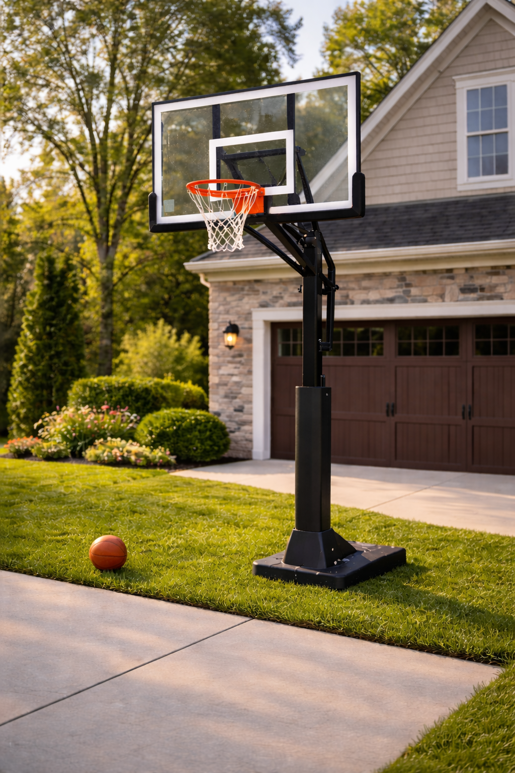 For in-ground basketball hoops, we cut the pole at or below ground level and can remove or bury the concrete base. Portable hoop bases are drained on-site. Soccer and hockey goals are disassembled and loaded. We take the entire assembly — poles, nets, backboards, bases, anchors, and all hardware.